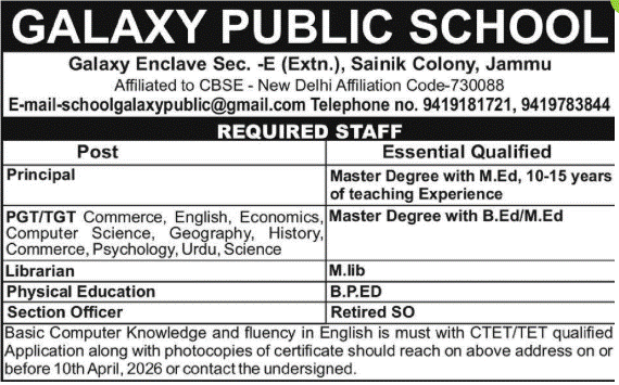 Application along with photocopies of certificates should reach the above address on or before 10th April, 2026, or contact the undersigned.