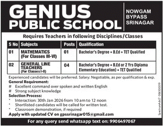 Genius Public School invites applications for teaching positions in the following disciplines/classes: