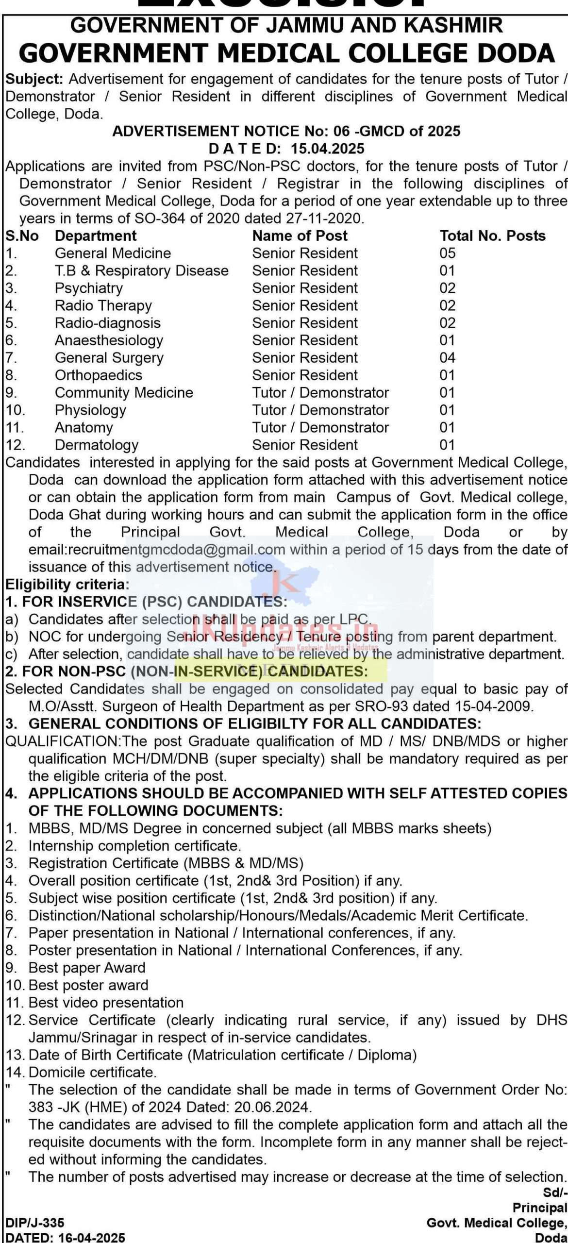 Advertisement for engagement of candidates for the tenure posts of Tutor / Demonstrator / Senior Resident in different disciplines of Government Medical College, Doda.