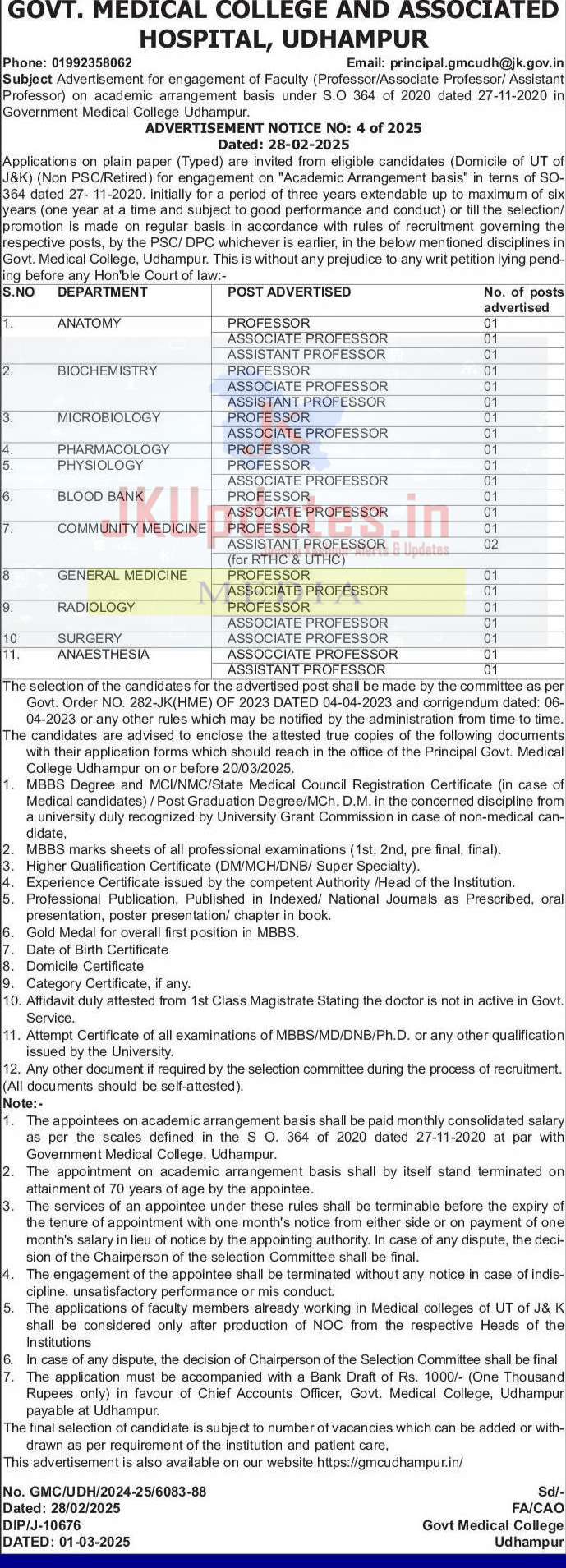 Applications on plain paper (Typed) are invited from eligible candidates (Domicile of UT of J&K) (Non PSC/Retired) for engagement on “Academic Arrangement basis” in terns of SO-364 dated 27- 11-2020. initially for a period of three years extendable up to maximum of six years (one year at a time and subject to good performance and conduct) or till the selection/ promotion is made on regular basis in accordance with rules of recruitment governing the respective posts, by the PSC/ DPC whichever is earlier, in the below mentioned disciplines in Govt. Medical College, Udhampur. This is without any prejudice to any writ petition lying pending before any Hon’ble Court of law:-