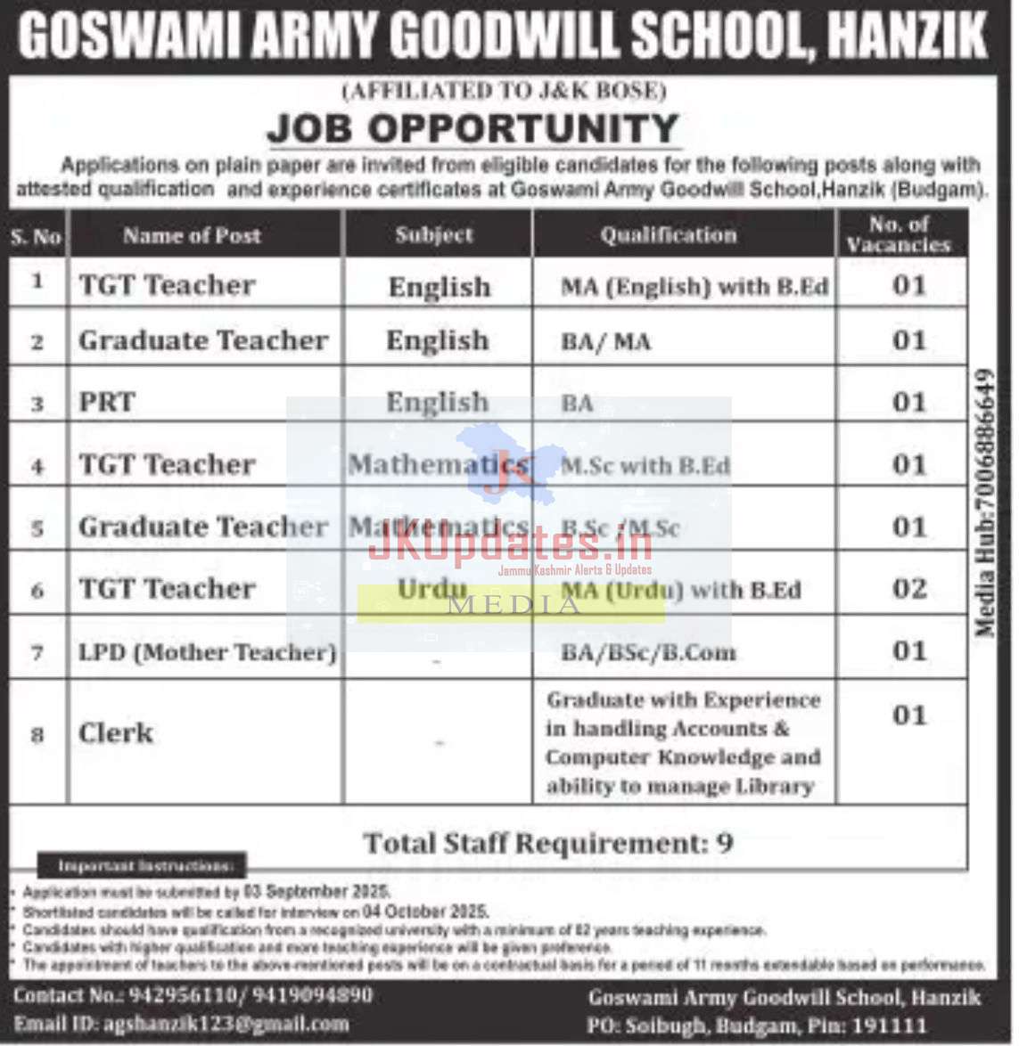 Applications on plain paper are invited from eligible candidates for the following posts along with attested qualification and experience certificates at Goswami Army Goodwill School, Hanzik (Budgam).