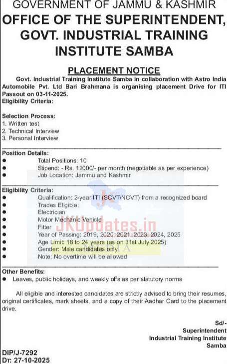 Govt ITI Samba in collaboration with Astro India Automobile Pvt. Ltd Bari Brahmana is organising placement Drive for ITI Passout on 03-11-2025