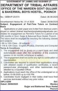 Applications on plain paper are invited from desirous unemployed or retired (trained teachers/graduate/postgraduate candidates for engagement as Part-time Tutors for a period of six (06) months in Govt. Gujjar & Bakarwal Boys Hostel, Poonch.
