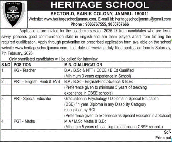 Apply through post/online on prescribed application form available on the school website www.heritageschooljammu.com.