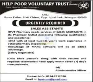 HPVT Pharmacy needs services of SALES ASSISTANTS in its Pharmacy Outlet possessing following qualification and experience: