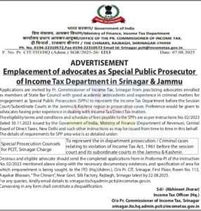 The Income Tax Department is seeking to empanel Special Prosecution Counsels for PCIT, Srinagar Charge.