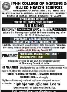 Eligibility: M.Sc (N) with specialization in OBG, Community, Pediatrics, Psychiatry, Medical Surgical Nursing with relevant experience as per guidelines of J&K Nursing Council / INC