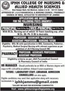Eligibility: M.Sc (N) with specialization in OBG, Community, Pediatrics, Psychiatry, Medical Surgical having relevant experience as per guidelines of J&K Nursing Council/INC