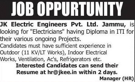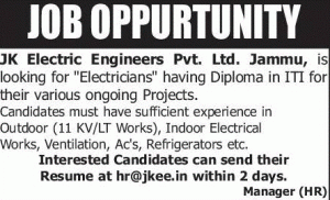 JK Electric Engineers Pvt. Ltd. Jammu, is looking for “Electricians”