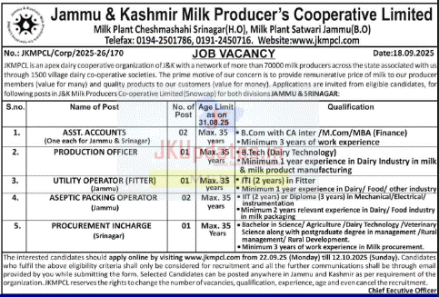 Job Recruitment in J&K Milk Producers Co-operative Ltd JKMPCL