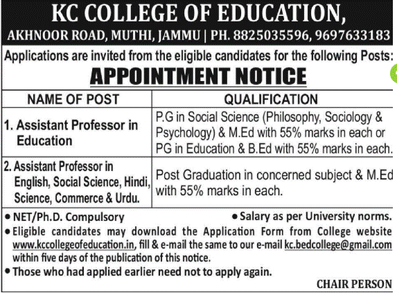 Eligible candidates may download the Application Form from the college website www.kccollegeofeducation.in, fill it and e-mail it to [email protected] within five days of the publication of this notice.