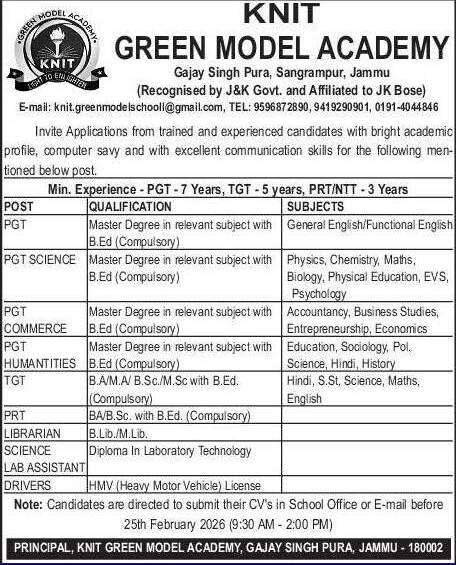Candidates are directed to submit their CV’s in School Office or E-mail before 25th February 2026 (9:30 AM – 2:00 PM)