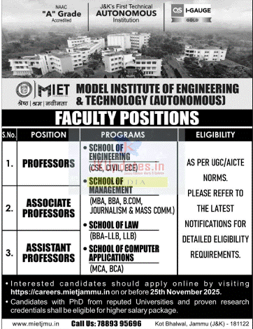 Interested candidates should apply online by visiting https://careers.mietjammu.in on or before 25th November 2025.