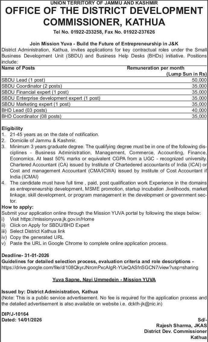 District Administration, Kathua, invites applications for key contractual roles under the Small Business Development Unit (SBDU) and Business Help Desks (BHDs) initiative. Positions include: