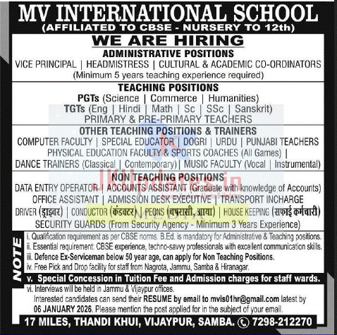 Jammu Jobs MV International School Jammu Jobs hiring for various positions