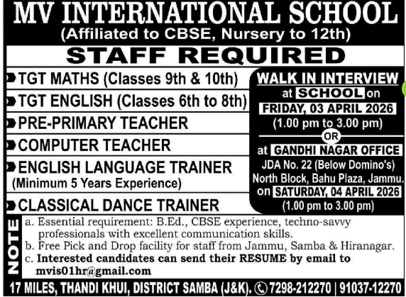 MV International School, a CBSE-affiliated institution (Nursery to Class 12th), has announced vacancies for multiple teaching and training positions. Eligible and experienced candidates are invited to attend walk-in interviews as per the schedule below.