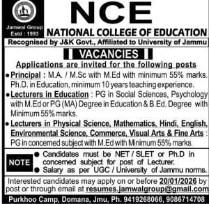 โข Lecturers in Physical Science, Mathematics, Hindi, English, Environmental Science, Commerce, Visual Arts & Fine Arts: