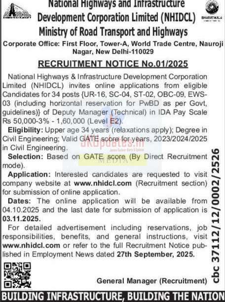 For detailed advertisement including reservations, job responsibilities, benefits, and general instructions, visit www.nhidcl.com or refer to the full Recruitment Notice published in Employment News dated 27th September, 2025.