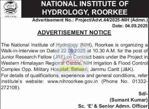 The National Institute of Hydrology (NIH), Roorkee is organizing a Walk-in-Interview on Dated 22.09.2025 at 10.30 A.M. for the post of Junior Research Fellow (JRF) on Contract basis under the Project in Western Himalayan Regional Centre, NIH Irrigation & Flood Control Complex Opp. Military Hospital, Satwari, Jammu Cantt (J&K).