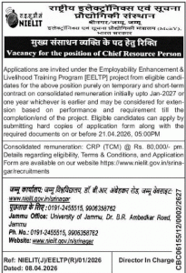 Applications are invited under the Employability Enhancement & Livelihood Training Program (EELTP) project from eligible candidates for the above position purely on temporary and short-term contract on consolidated remuneration initially up to January 2027 or one year, whichever is earlier, and may be considered for extension based on performance and requirement till the completion/end of the project.