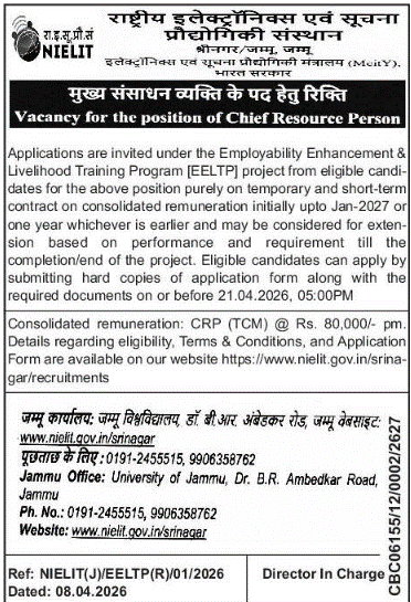 Details regarding eligibility, terms & conditions, and application form are available on the official website: https://www.nielit.gov.in/srinagar/recruitments