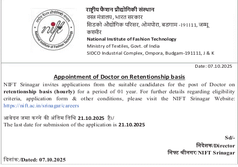 NIFT Srinagar invites applications from the suitable candidates for the post of Doctor on retentionship basis (hourly) for a period of 01 year. For further details regarding eligibility criteria, application form & other conditions, please visit the NIFT Srinagar Website: