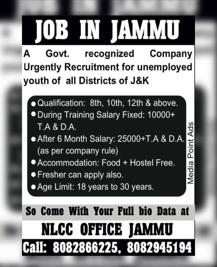How To Apply : So come with your full biodata at NLCC OFFICE JAMMU, 33 A Opp Aggarwal Dharamshala Near Vivekanand chowk gurudwara sunder singh Road Jammu .