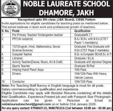 Invite applications for eligible candidates for teaching posts as mentioned below.