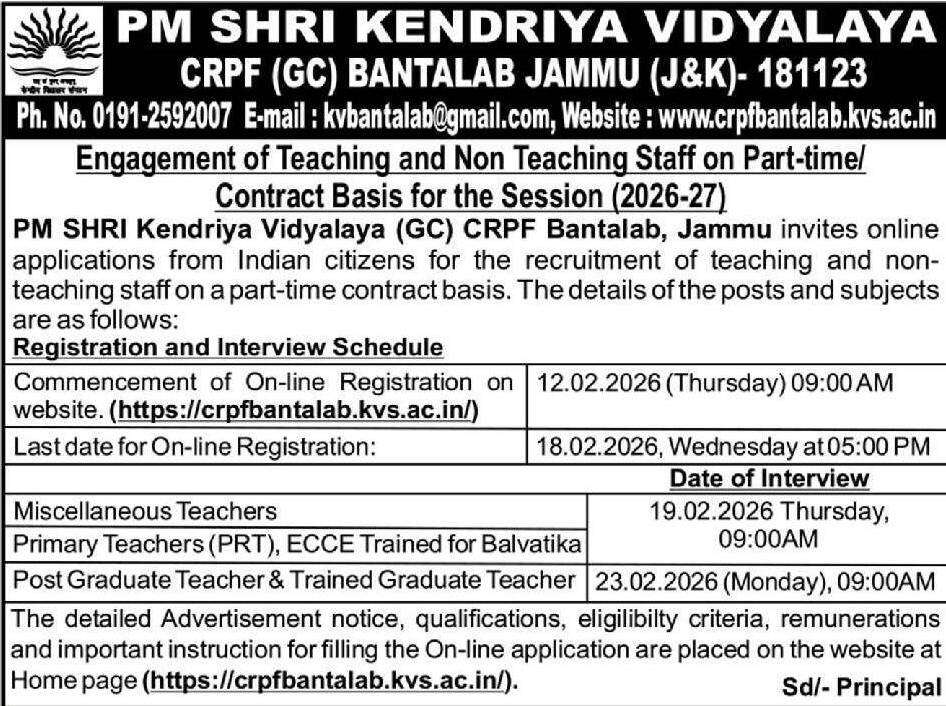 PM SHRI Kendriya Vidyalaya (GC) CRPF Bantalab, Jammu invites online applications from Indian citizens for the recruitment of teaching and non-teaching staff on a part-time contract basis. The details of the posts and subjects are available on the official website.