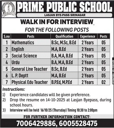 Jammu Kashmir JobsJobs in KashmirPrivate JobsSchool Jobs
