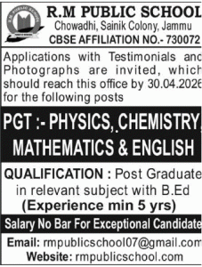 Applications are invited along with testimonials and photographs. Interested candidates should ensure their applications reach the school office by 30th April 2026 for the following positions :