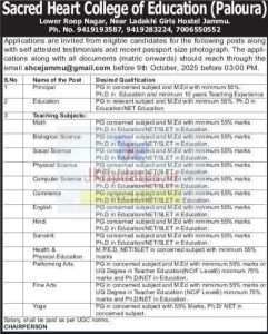 1 Principal PG in concerned subject and M.Ed with minimum 55%. Ph.D in Education and minimum 10 years Teaching Experience