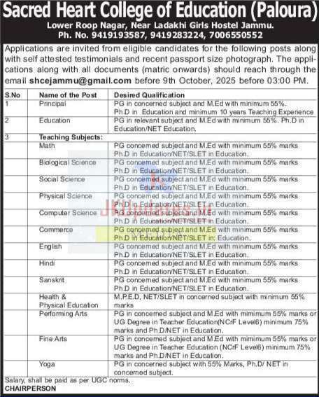 Performing Arts : PG in concerned subject and M.Ed with minimum 55% marks or UG Degree in Teacher Education(NCrF Level6) minimum 75% marks and Ph.D/NET in Education.
