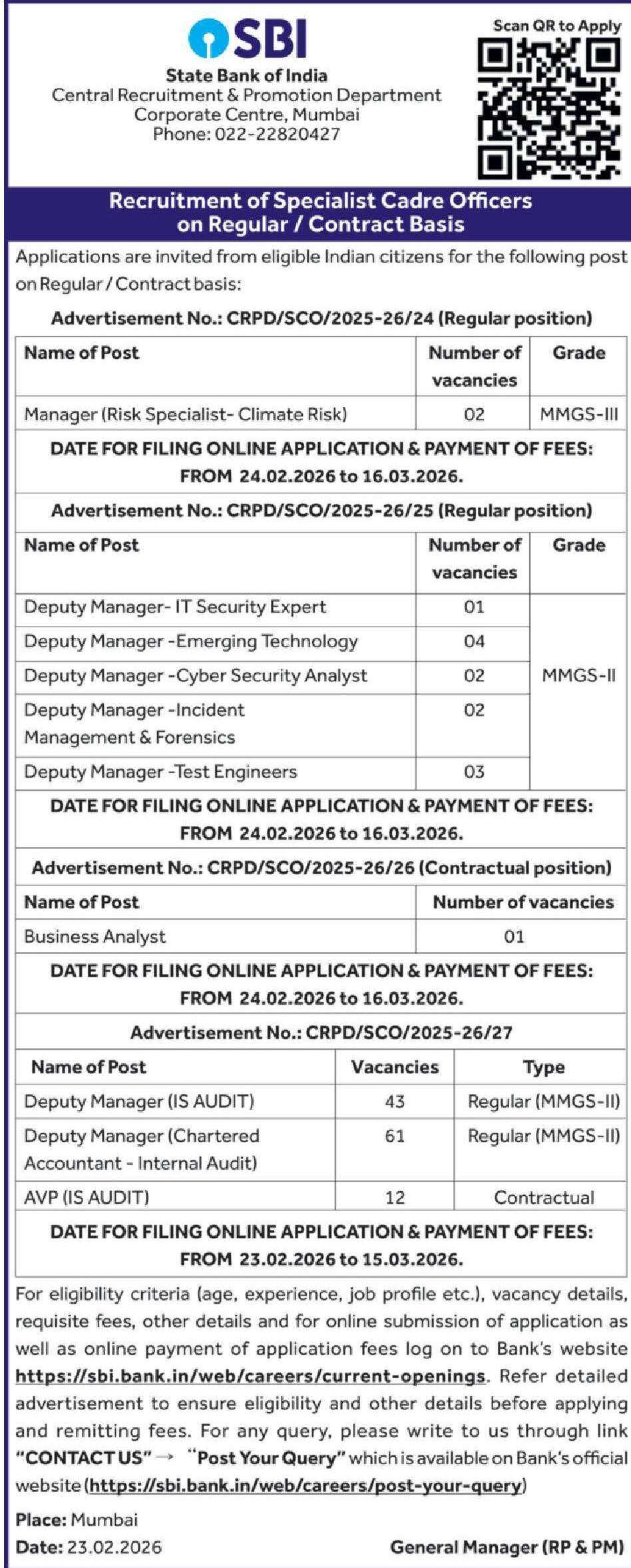 For eligibility criteria (age, experience, job profile, etc.), vacancy details, requisite fees, and other information, candidates are advised to visit the Bank’s website: