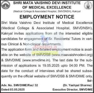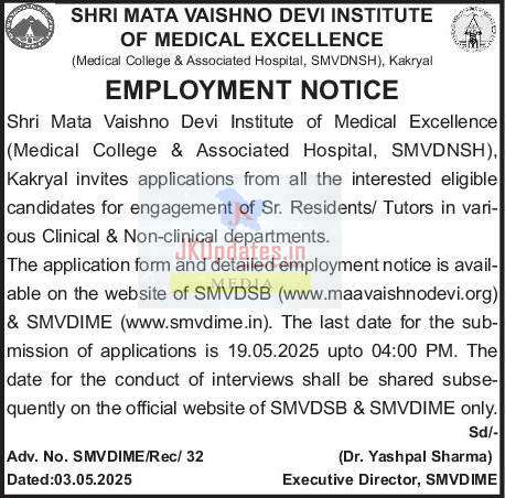 Shri Mata Vaishno Devi Institute of Medical Excellence (Medical College & Associated Hospital, SMVDNSH), Kakryal invites applications from all the interested eligible candidates for engagement of Sr. Residents/ Tutors in various Clinical & Non-clinical departments.