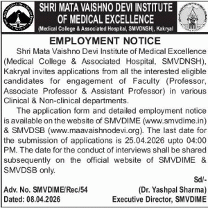 Shri Mata Vaishno Devi Institute of Medical Excellence, Kakryal, invites applications from all interested and eligible candidates for engagement of Faculty in various Clinical and Non-Clinical Departments.