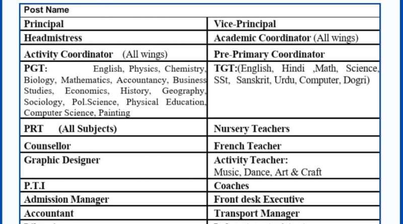 PGT : English, Physics, Chemistry, Biology, Mathematics, TGT:(English, Hindi ,Math, Science SSt, Accountancy, Business Studies, Economics, History, Sanskrit, Urdu, Computer, Dogri)