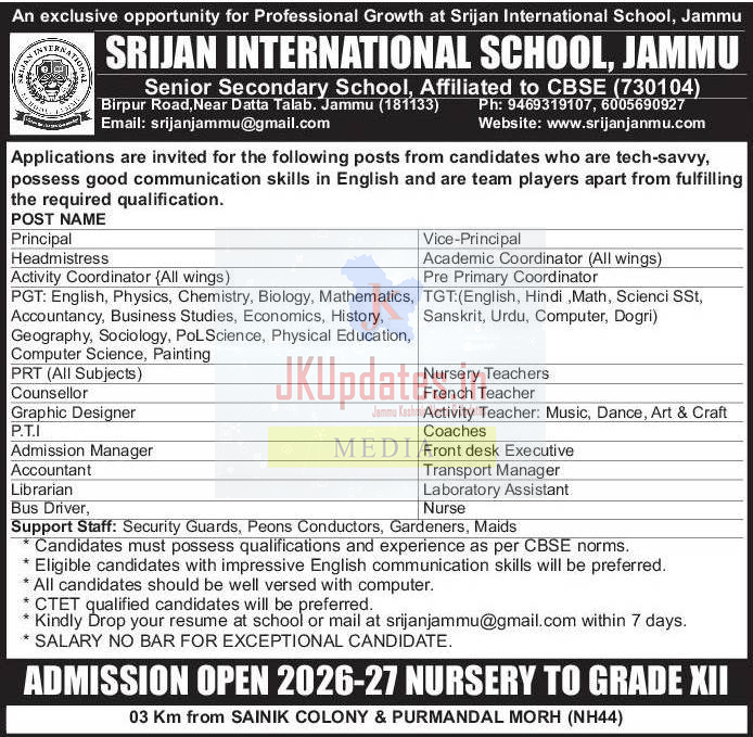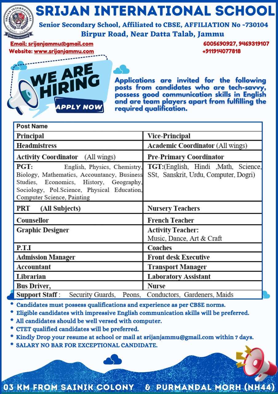 Job Recruitment in SRIJAN INTERNATIONAL SCHOOL, JAMMU