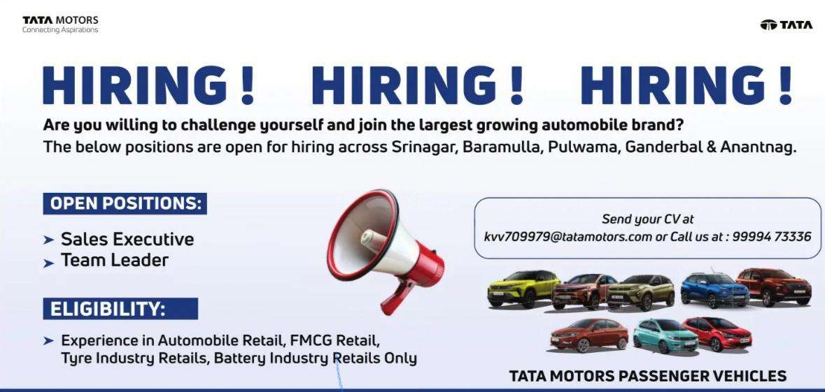 The below positions are open for hiring across Srinagar, Baramulla, Pulwama, Ganderbal & Anantnag.