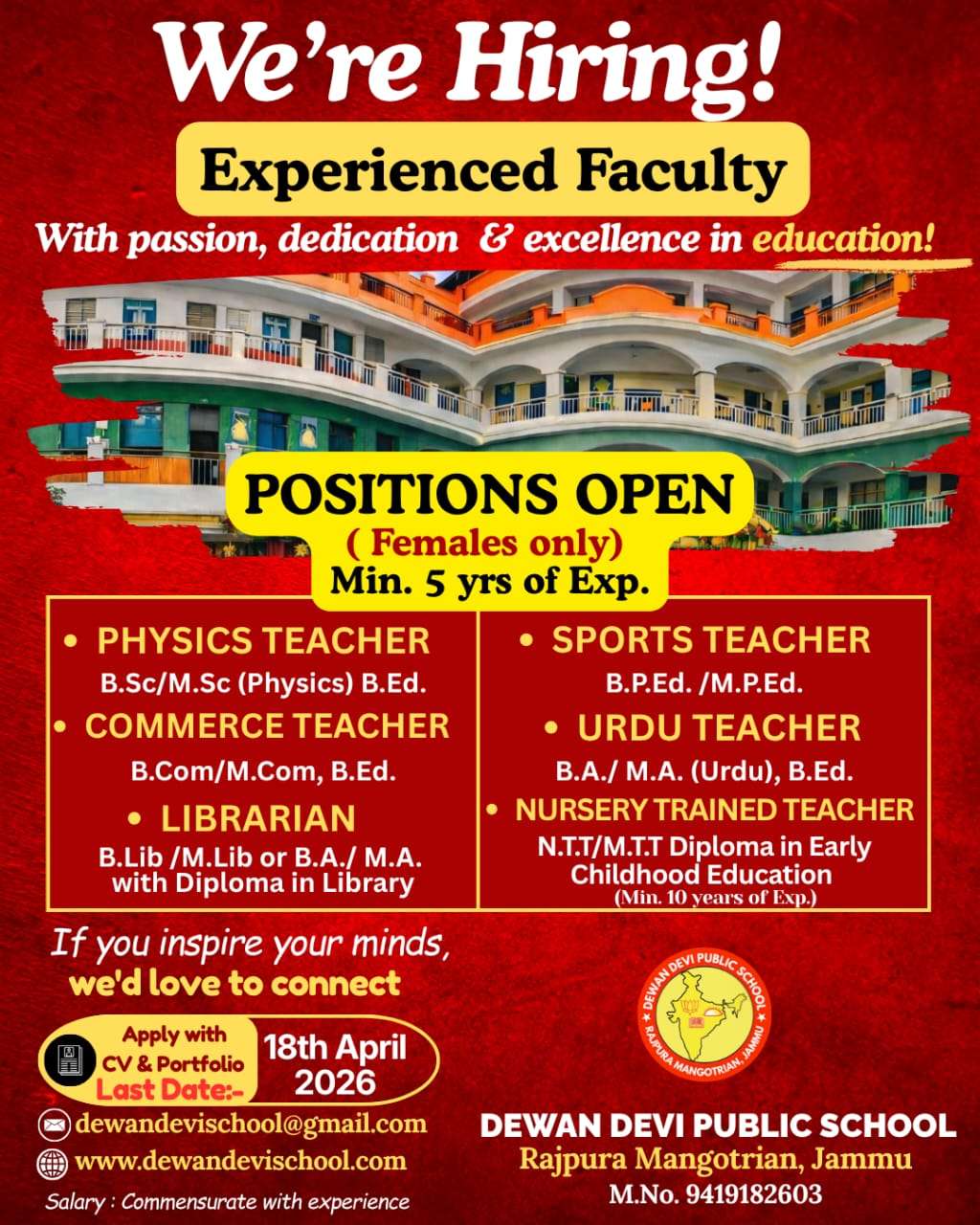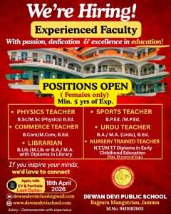 JOB VACANCY in DEWAN DEVI PUBLIC SCHOOL, JAMMU
