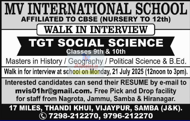 Walk in for interview at school on Monday, 21 July 2025 (12 noon to 3 pm).