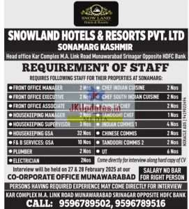 Kashmir Jobs: Recruitment in Snowland Hotels & Resorts Pvt. Ltd