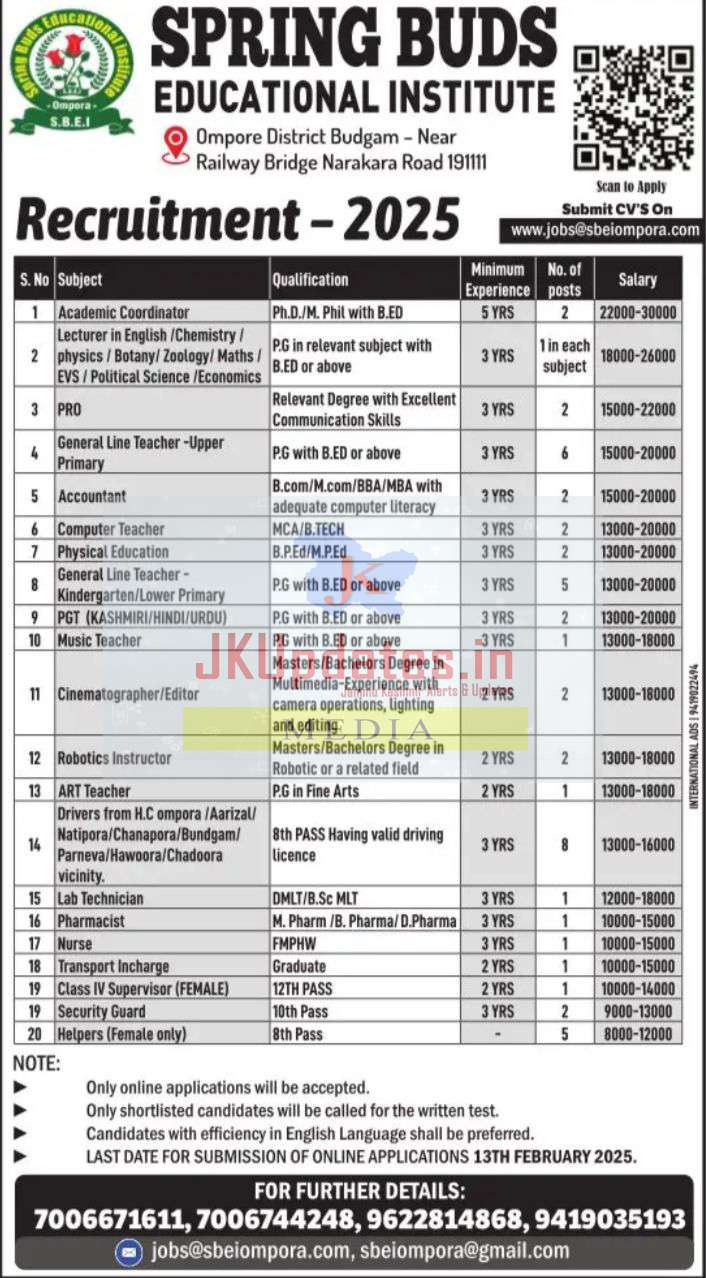 Kashmir Jobs: Recruitment in Spring Buds Educational Institute 2025