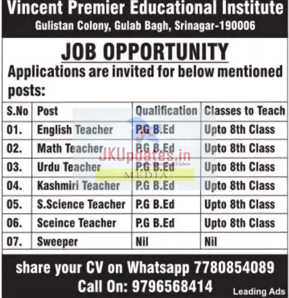 Kashmir Jobs: Recruitment in Vincent Premier Educational Institute