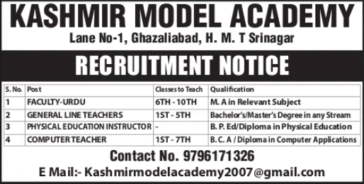 Kashmir Model Academy, located at Lane No. 1, Ghazaliabad, H.M.T Srinagar, invites applications from qualified and experienced candidates for the following teaching and instructor positions.