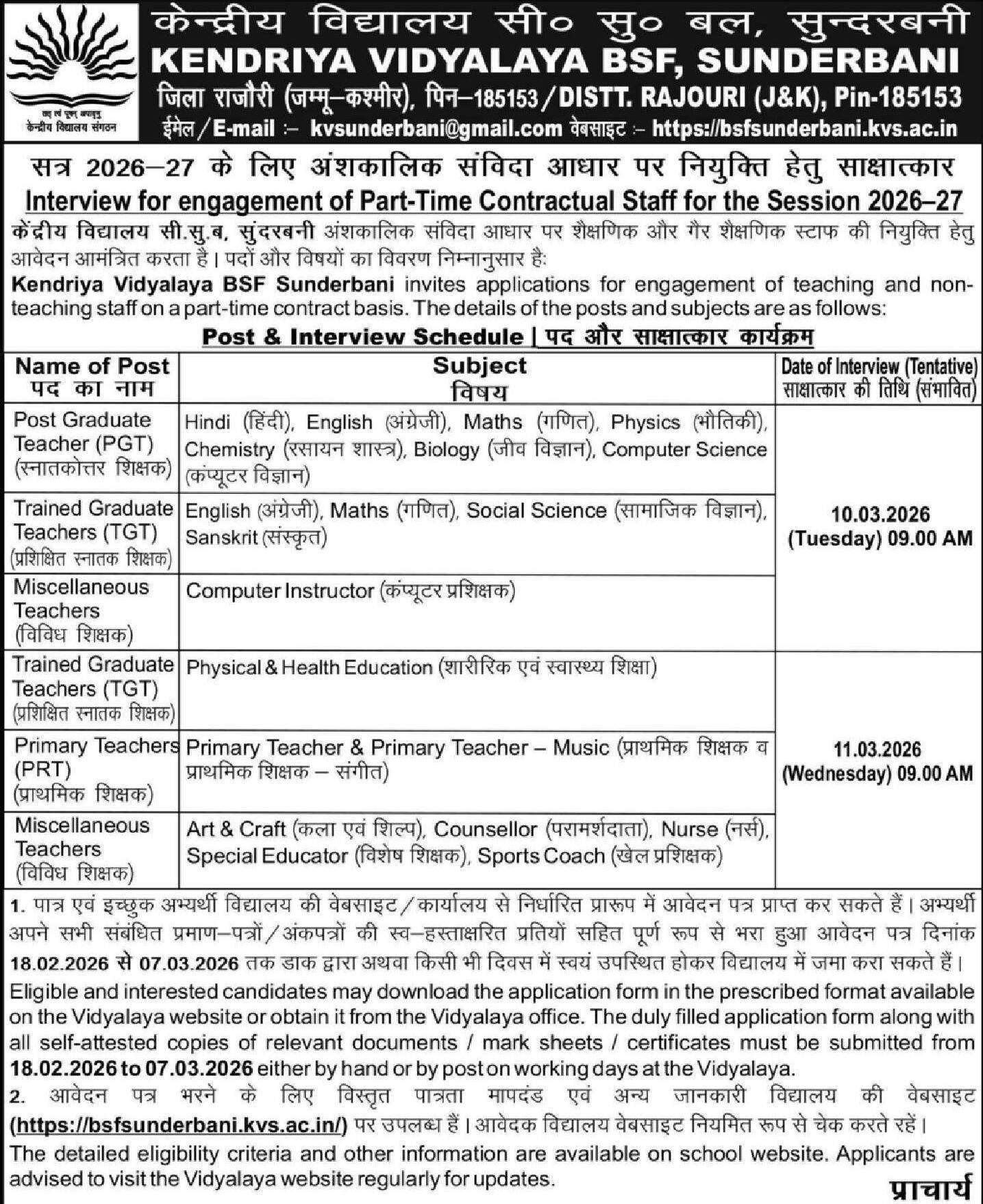 Kendriya Vidyalaya BSF Sunderbani invites applications for engagement of teaching and non-teaching staff on a part-time contract basis for the academic session 2026–27. The details are as follows: