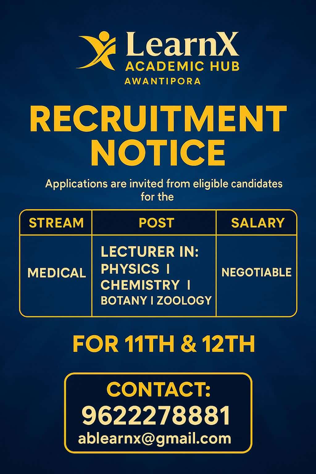 LearnX Academic Hub, located in Awantipora, has announced a recruitment notice inviting applications from qualified and eligible candidates for lecturer positions in the Medical stream.