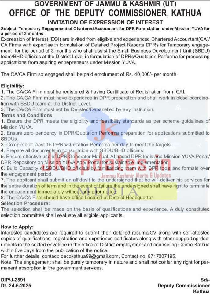Expression of Interest (EOI) are invited from eligible and experienced Chartered Accountant (CA)/CA Firms with expertise in formulation of Detailed Project Reports DPRs for Temporary engagement for the period of 3 months who shall assist the Small Business Development Unit (SBDU) team/BHD officials at the District Level in formulation of DPRs/Quotation Performa for processing applications from aspiring entrepreneurs under Mission YUVA.