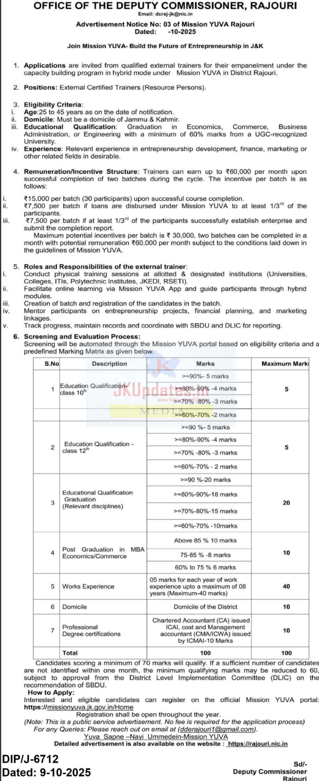 Applications are invited from qualified external trainers for their empanelment under the capacity building program in hybrid mode under Mission YUVA in District Rajouri.