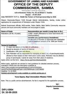 Mission Directorate-Mission YUVA through District Administration, Samba, invites online applications for empanelment of Motivators under Mission YUVA.
